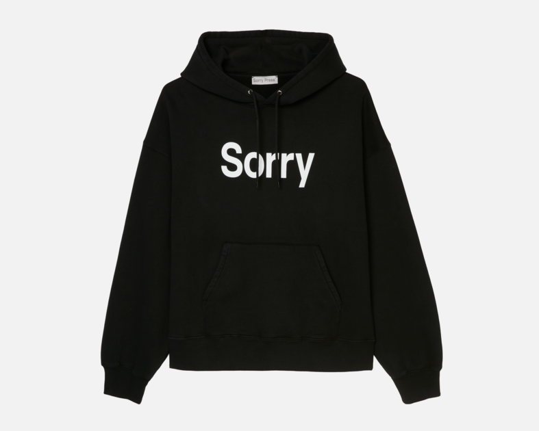 Classic "Sorry" Hoodie * Superior Essential* Total Trend Control* Lifetime Conversation PieceBlack 100% organic cottonPre-shrunk500g/m2Boxy fitTrue to sizeResize or reimbursement at your own shipping cost. Sorry!